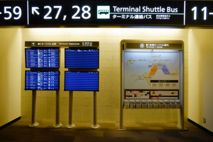 Bên trong các teminal có các khu vực làm thủ tục trước và sau khi xuất cảnh, ở mỗi khu vực đều có nhà hàng, quầy bán hàng lưu niệm và quầy sách. Ở khu vực sau khi làm thủ tục xuất cảnh cánh phía nam trong terminal 1 có một khu mua sắm miễn thuế mang phong cách hiện đại của Nhật Bản tên là "Narita Nakamise".